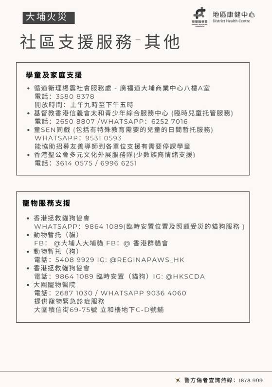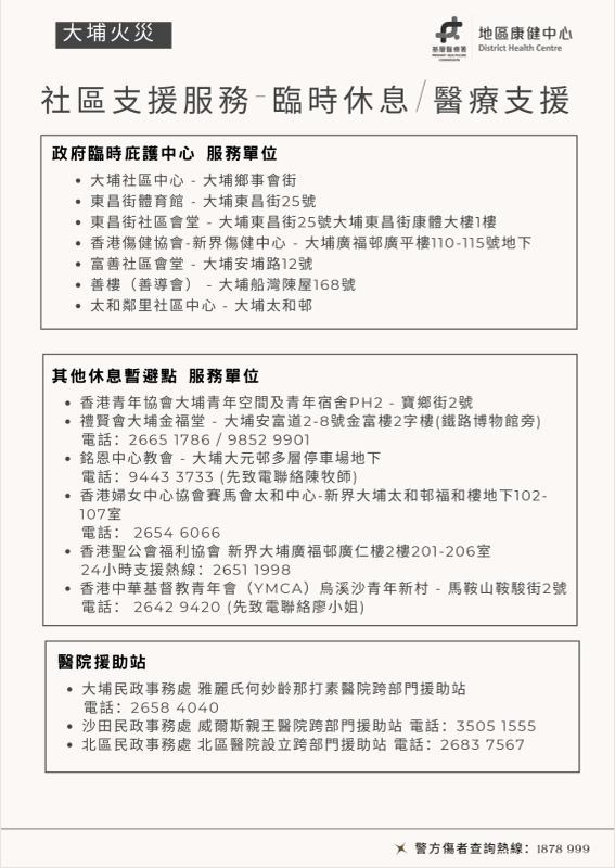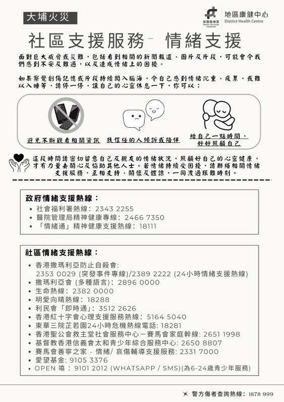 面對突如其來的事故,我們與大家同心同行,提供大埔火災社區支援資料,希望能為有需要的朋友提供協助,大家也可分享給身邊有需要的人士。服務資訊包括: 政府臨時庇護中心及休息暫避點 醫院援助站 照顧情緒方法 情緒支援熱線 學童及家庭支援 寵物服務支援 警方傷者查詢熱線:1878 999 溫馨提示:請記得好好照顧自己,避免過度接觸災難資訊,給自己時間休息,並與信任的人傾訴。 讓我們彼此守望,好好照顧自己及別人,共渡艱難時刻 #灣仔地區康健站 #社區支援 #庇護中心 #醫院援助站 #情緒支援 #康健同行